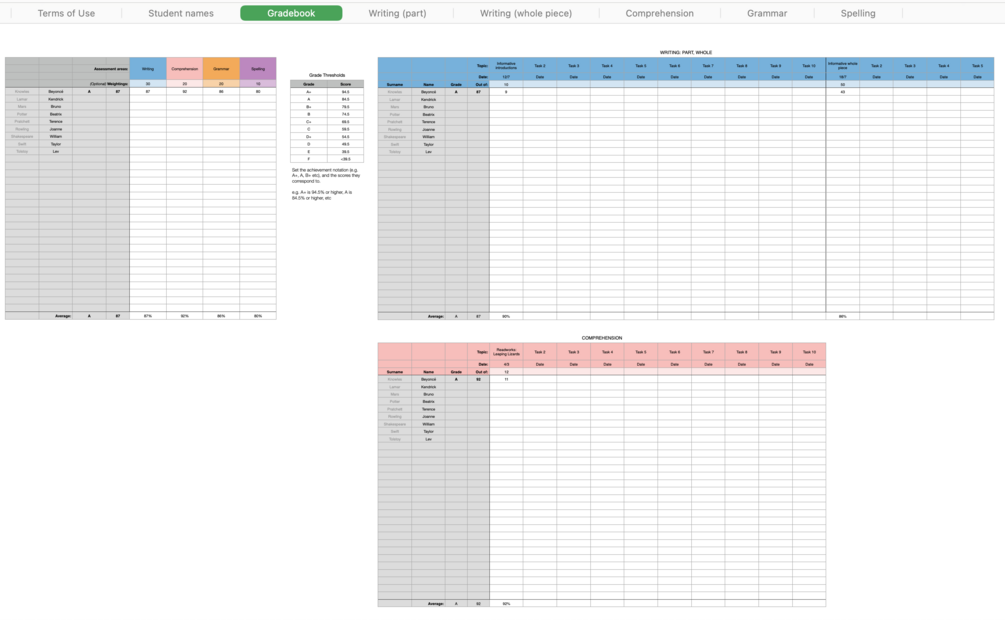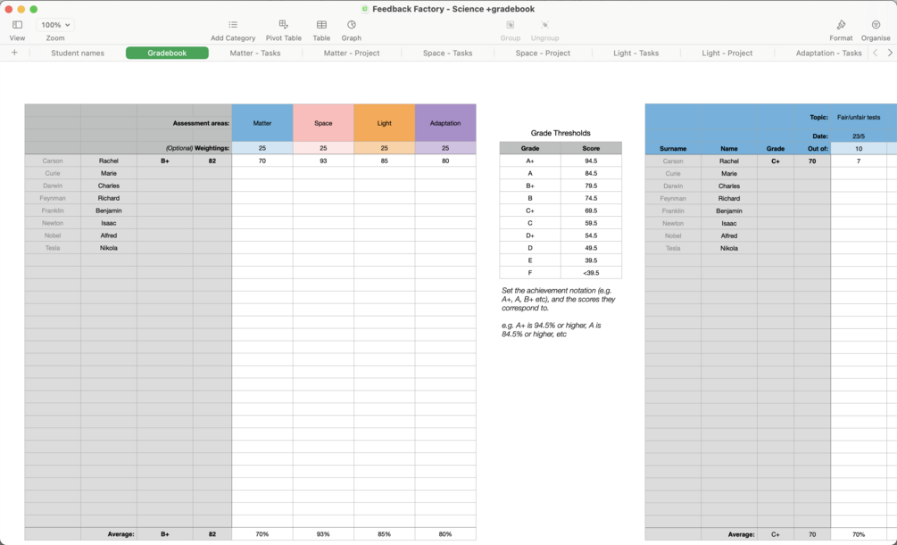 - They also include a gradebook, for automatically calculating grade averages (with customisable grade thresholds and weightings), and providing an overview of achievement across various tasks in various areas.